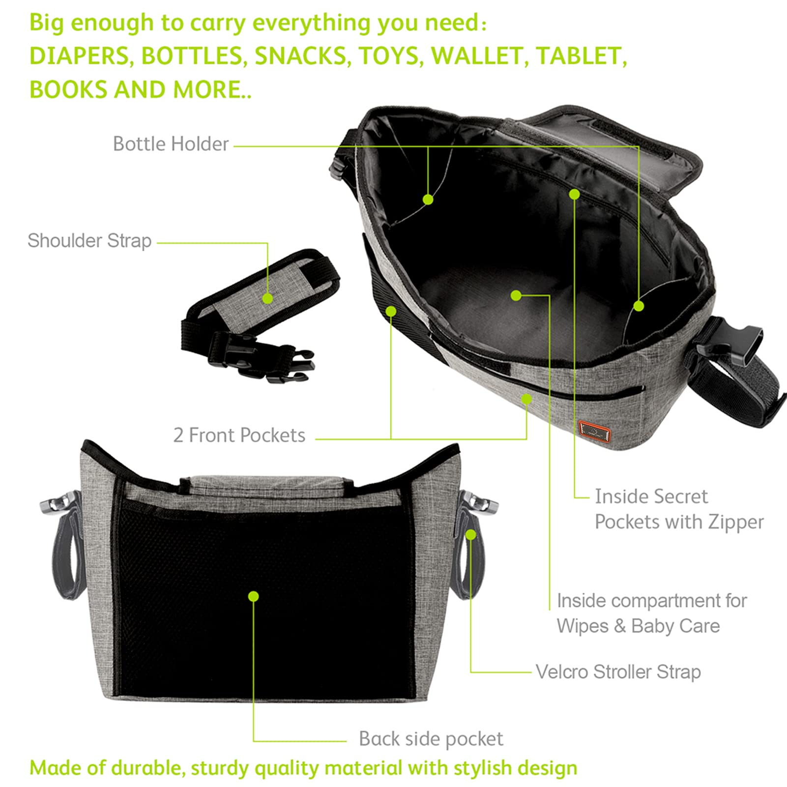 Stroller Organizer Bag 11 L – Cup Holder & Shoulder Strap, Gray