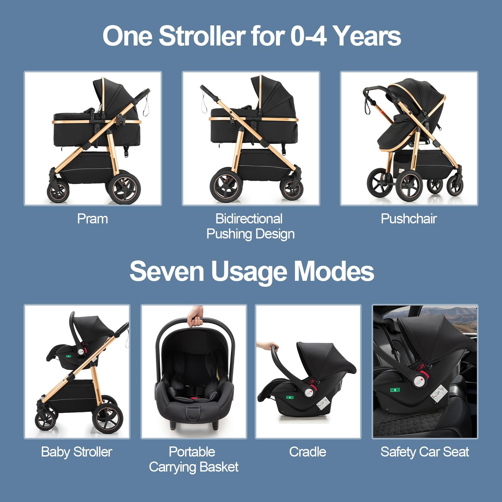 Gcarebb 3 in 1 Prams Travel System, Pushchair with Height Adjustable Handle, Travel Pram with Rain Cover, Baby Stroller with Aluminum Frame for Newborn 0-4 Years