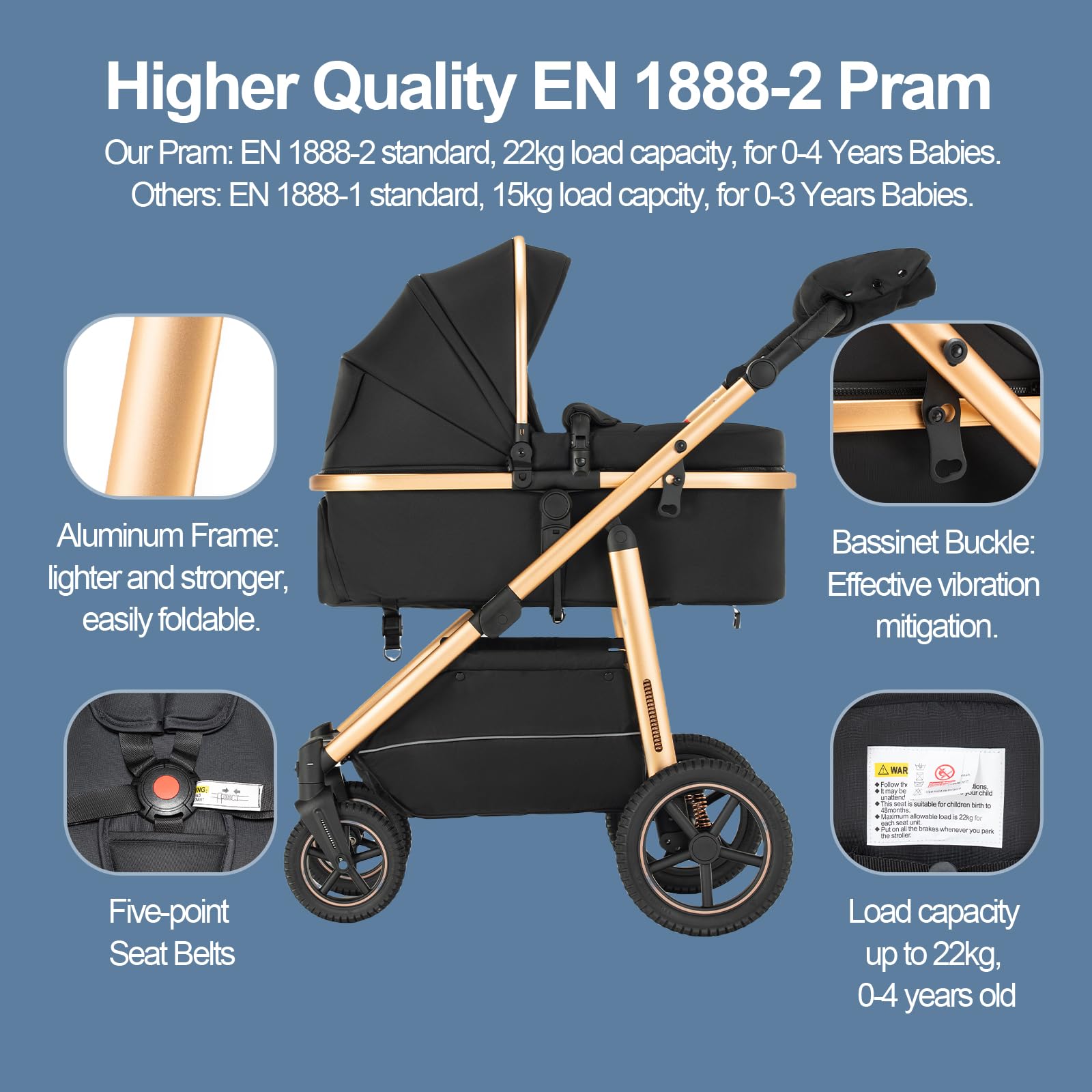 - 【Higher Quality Pushchair with EN1888-2】Gcarebb pushchair is suitable for babies from 0 to 4 years old, weighing less than 22kg. The pram is equipped with shock-absorbing snap hooks, which can greatly reduce the impact of the pram when moving and make the pram more comfortable. Also included is a cold protection pram cover, a cold protection car seat cover, a rain cover, a mosquito net, a set cold and sun protection gloves, a soft cushion, a cup holder and a large backpack bag.